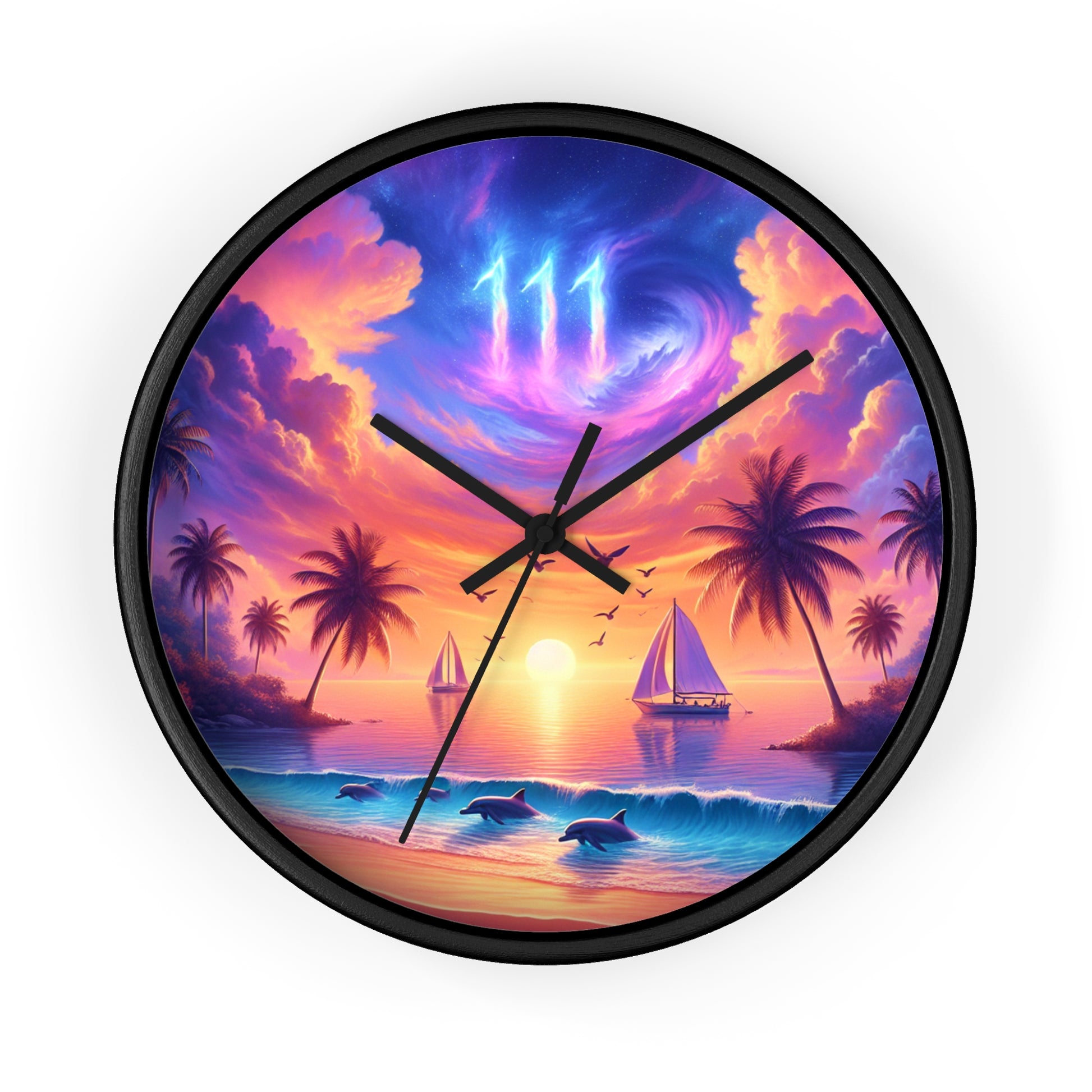 Introducing a stunning wall clock! Showcasing a tranquil beach sunset scene with vibrant colors, silhouetted palm trees, serene sailboats, and playful dolphins. The significant 'Angel Numbers' 1111 subtly adorn the center, adding harmony and spiritual significance. #WallClock #BeachSunset #PalmTrees #Sailboats #Dolphins #1111 #AngelNumbers #HomeDecor #UniqueDesign #TropicalParadise. Angel number 1111 serves as a reminder to be mindful of your thoughts and intentions. Your angels are urging you to maintain a positive mindset and focus on what you truly desire. Take some time each day to visualize your goals and affirm your intentions. Silent clock mechanism and available in natural wood, black and white frame variations with black or white hands to match your design.