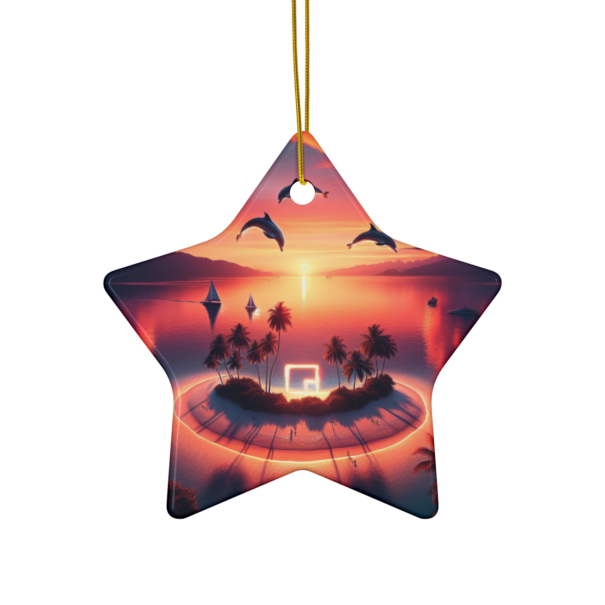 Ceramic Ornament Star, Heart, Snowflake or Circle 1111 "Paradise Twilight: A Journey Into Tropical Serenity" - Tropical Beach Sunset with Palm Trees, Dolphins, and Sailboats