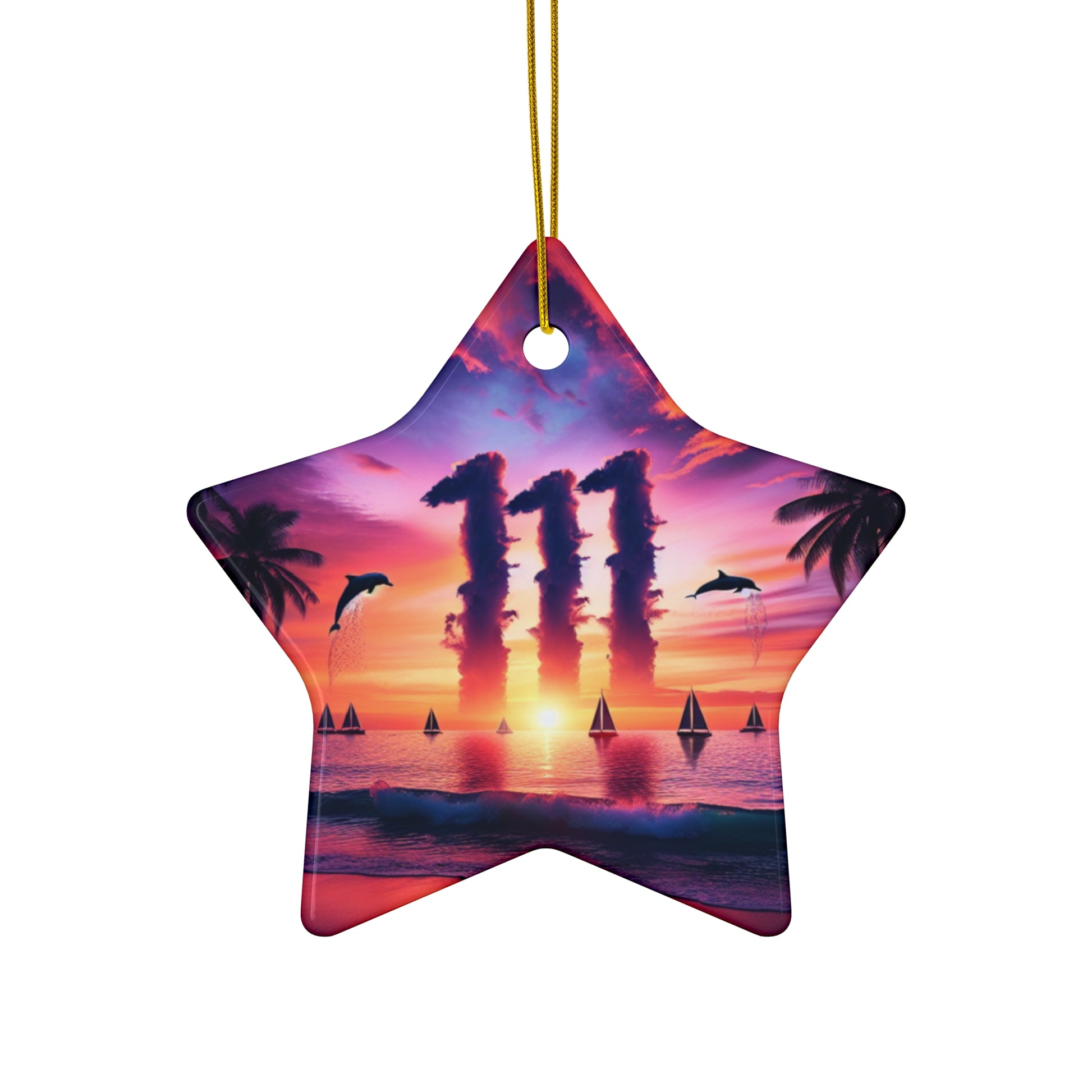 Unveil the serenity of a beach sunset with our stunning ceramic ornament. Revel in the mesmerizing hues of orange, pink and purple as the sun sets, casting shadows off clusters of palm trees. Admire playful dolphins leap amidst distant sailboats, all within the ethereal glow of '1111'. Perfect to add that relaxing yet striking touch to any space. #TropicalBeach #SunsetDecor #CeramicOrnament #BeachyVibes #HomeDecor #TropicalParadise #SunsetLovers #SailboatDecor #MarineLife #InspirationalDesign Angel number 1111 serves as a reminder to be mindful of your thoughts and intentions. Your angels are urging you to maintain a positive mindset and focus on what you truly desire. Take some time each day to visualize your goals and affirm your intentions.