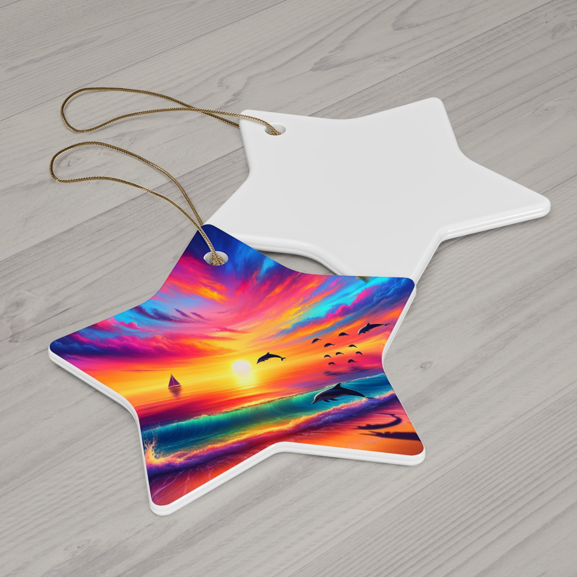 Ceramic Ornament - Tropical Beach Sunset Star, Heart, Snowflake, Circle, Dolphins, Sailboats - Holiday Christmas Tree Decoration, Gift for
