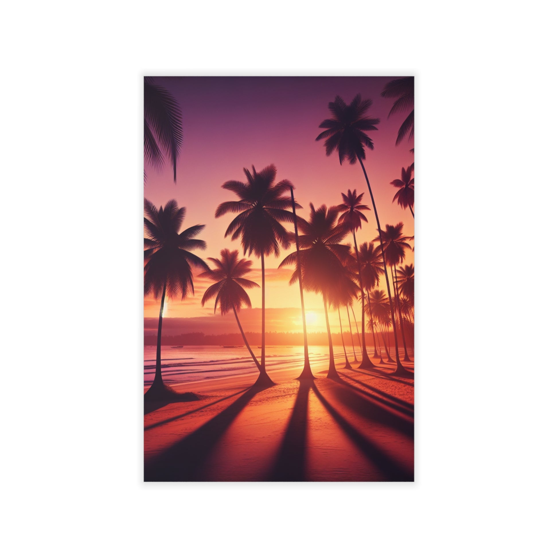 Removable and repositionable adhesive. "Immerse in tranquility with our Repositionable Wall Art featuring a romantic tropical beach at sunset. The swaying palm trees against hues of orange, purple, and pink skies evoke serenity. Taste the sea salt in the air and enjoy the gentle ocean wave lullaby. #WallArt #TropicalBeach #RomanticScene #SunsetVibes #PeacefulHomeDecor #NatureInspired #SaltySeaAir #OceanWaves #PalmTrees #EveningBreeze" -0.15mm thick and durable polyester material - Pleasant woven texture