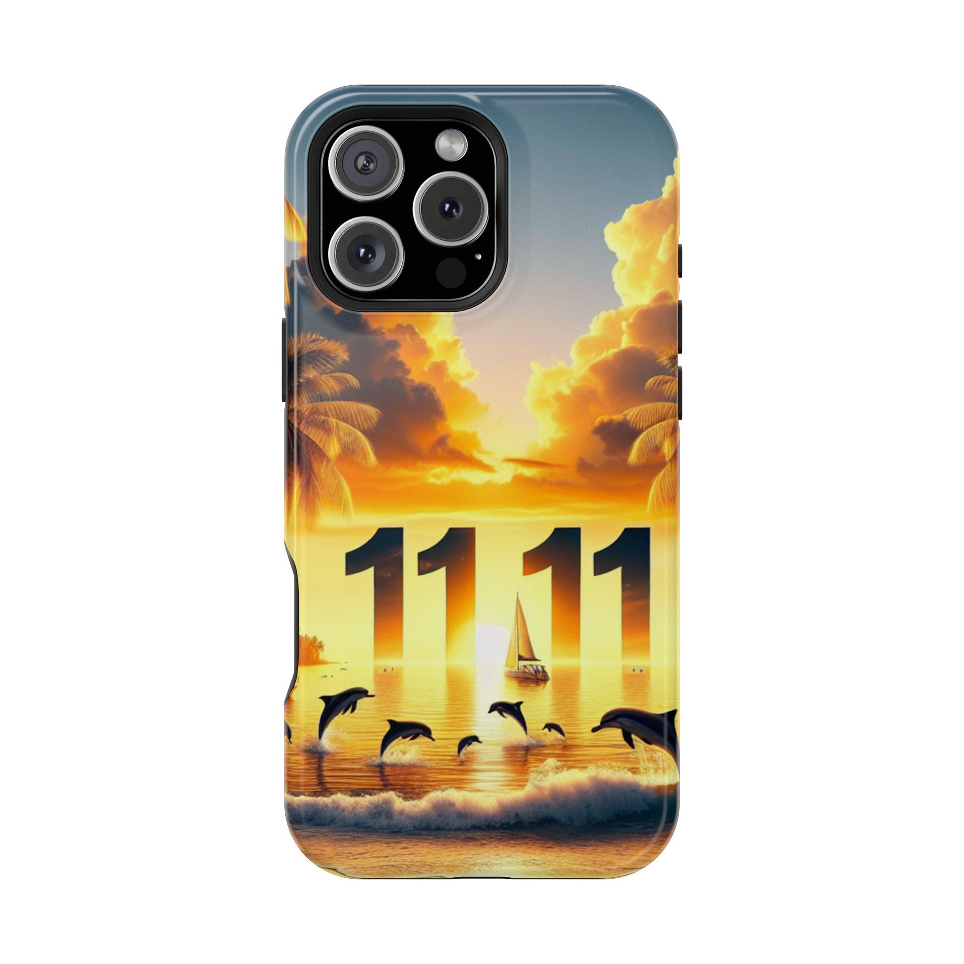 "Immerse in paradise with these tough phone cases for iPhone. Display a stunning tropical beach scenery during sunset, adorned with frolicking dolphins and sailboats. The striking '1111' design holds the scene together. Ensure safety with style, anywhere. #Beach #Tropical #Sunset #iPhoneCase #ToughCase #Paradise #Dolphins #1111 #PhoneProtection" When aesthetics meet function, this custom magnetic tough case is born. Equipped with an outer polycarbonate shell and inner black TPU lining, this case delivers robust protection thanks to its durable, flexible, impact-resistant nature. - Made and Shipped from USA