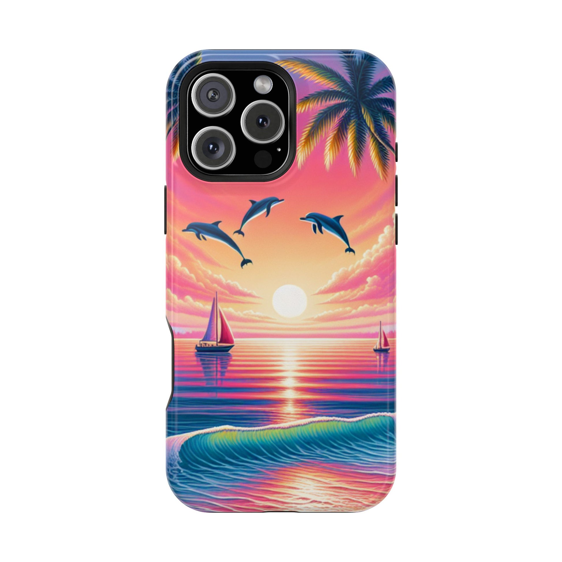 Magnetic Iphone 16 15 14 13 Pro and Max "Sunset Serenity: Tropical Paradise" - Tough Phone Case with Tropical Beach Sunset Dolphins ande Sailboats HD Art