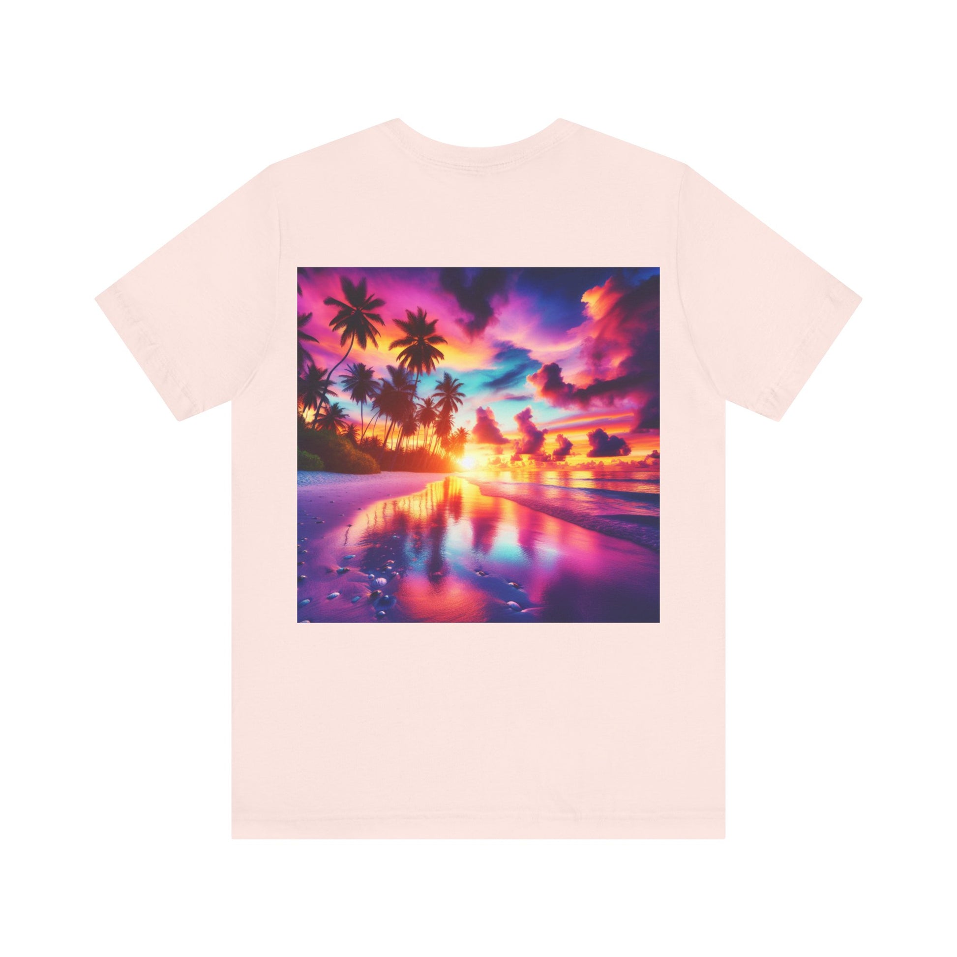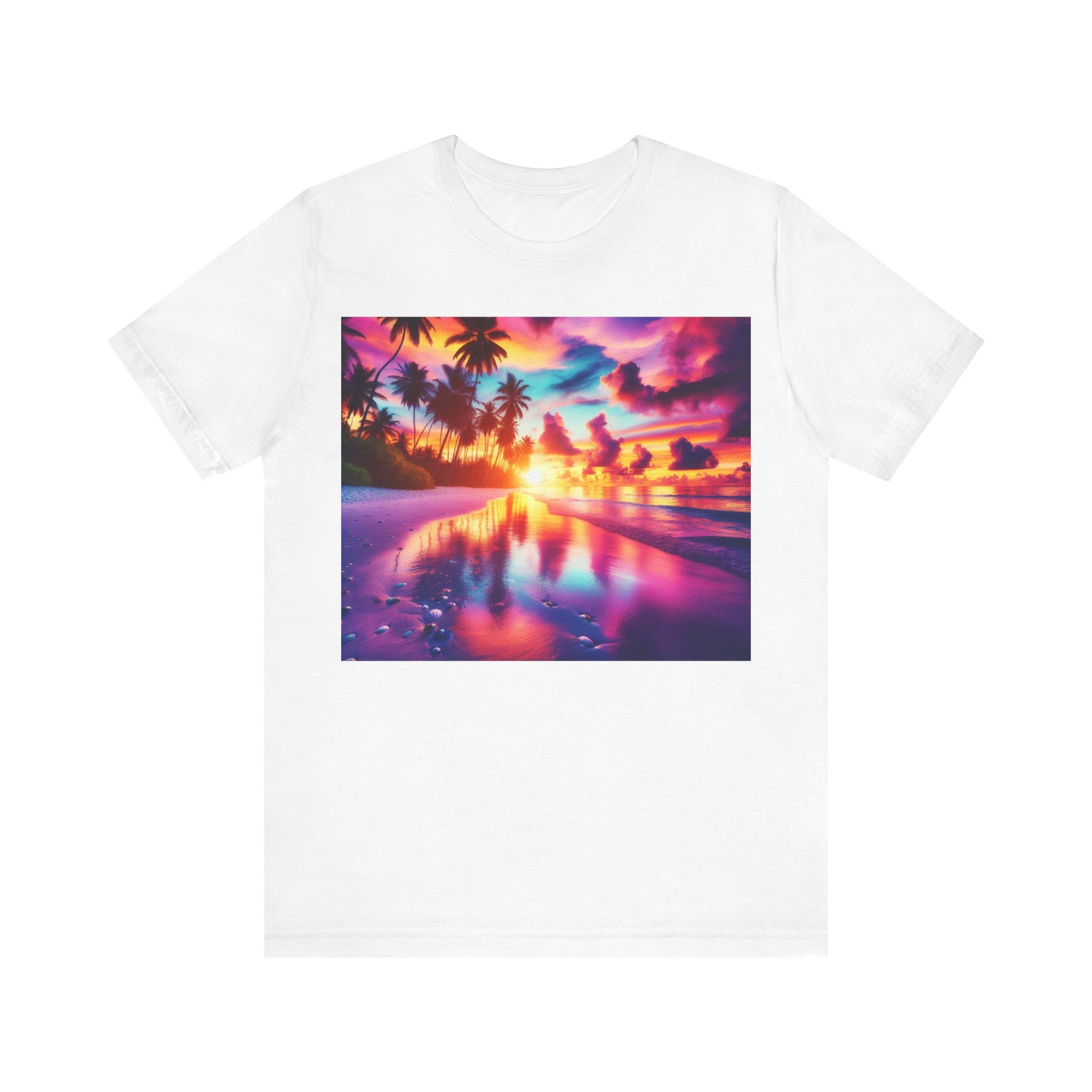 Discover a world of tranquility with our Tropical Sunset T-Shirt. Adorned with lush palms, tinted skies, and serene beach views, this shirt captures a dreamy, painterly sunset. Let the blend of vivid oranges, pinks, purples, and calming blues take you to paradise everytime you wear it. #TropicalTee #SunsetShirt #BeachWear #PalmsAndParadise #VacationVibes #ArtisticTees #TropicalEscape #SereneStyle #TranquilTrend #FashionEscape This classic unisex jersey short sleeve tee fits like a well-loved favorite. Soft cotton and quality print make users fall in love with it over and over again. These t-shirts have-ribbed knit collars to bolster shaping. The shoulders are tapered for a better fit over time. Dual side seams hold the garment's shape for longer.