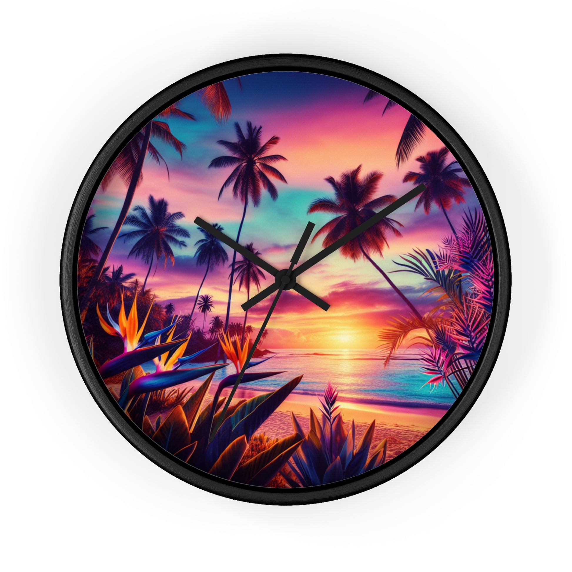 Experience tranquility at home with our Tropical Sunset Wall Clock. The stunning design showcases an enchanting beach during sunset, silhouettes of palm trees, and vibrant bird of paradise plants. Relax as time gently laps by. #WallClock #HomeDecor #BeachVibes #SunsetLovers #TropicalParadise #PalmTrees #BirdofParadise #Exotic #Tranquil #ClockDesign Features Silent clock mechanism and available in natural wood, black and white frame variations with black or white hands to match your design. Requires one AA battery (NOT included)