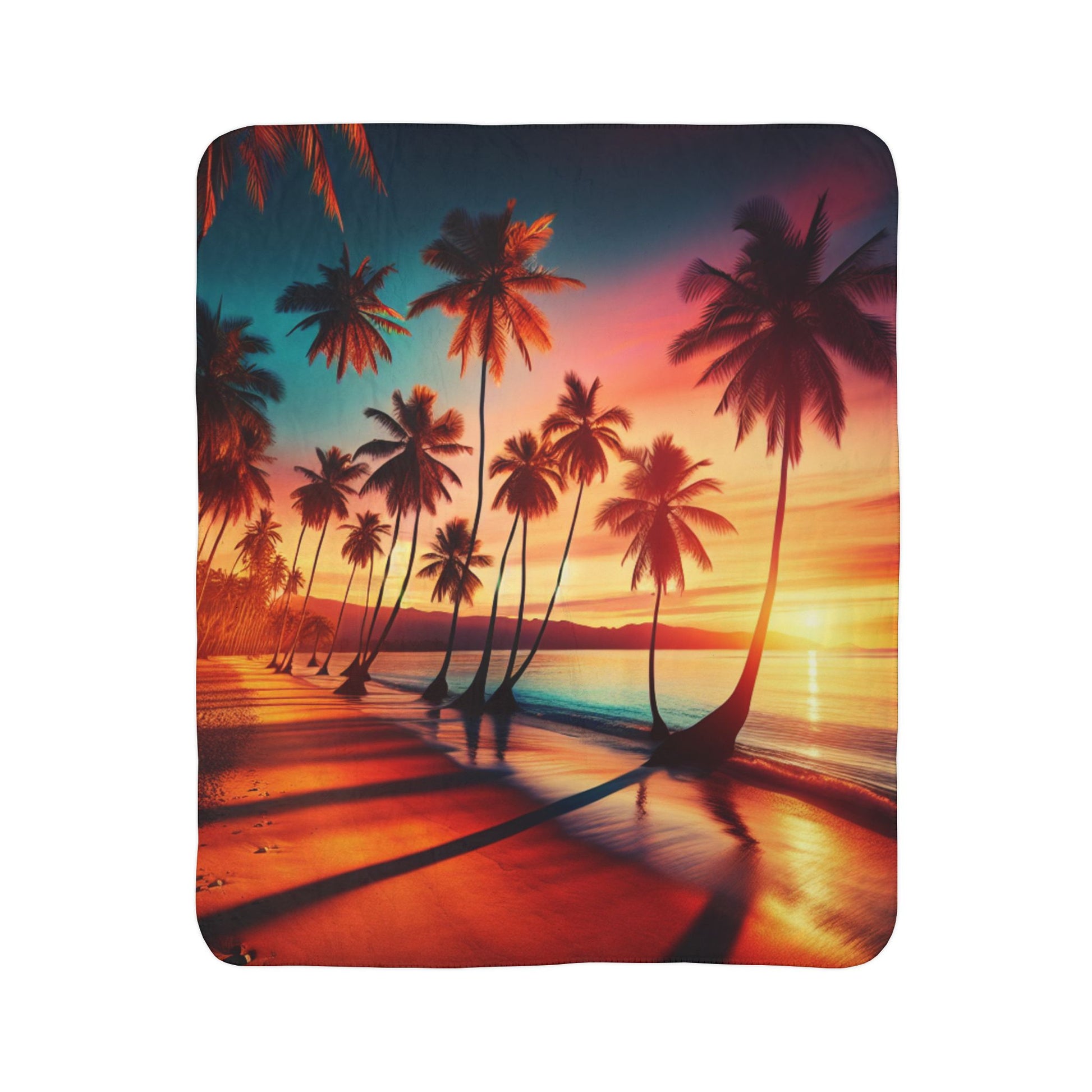 Immerse yourself in paradise with our Tropical Sunset Sherpa Fleece Blanket. 100% polyester, this blanket paints a serene story of palm trees swaying in the sunset and a warm beach underfoot. Transcend the everyday and relax in warmth and luxury. #TropicalBlanket #SherpaFleece #Polyester #LuxuryHome #WarmthAndComfort #TropicalSunset #BeachLife #RoomDecor #TranquilLiving #CozyBlanket 1/8'' (3mm) thick for extra warmth and a feel that is supremely soft to the touch.All fleeces come with a one-sided print and a velvety, plush backside for extra coziness. Available in 2 sizes.