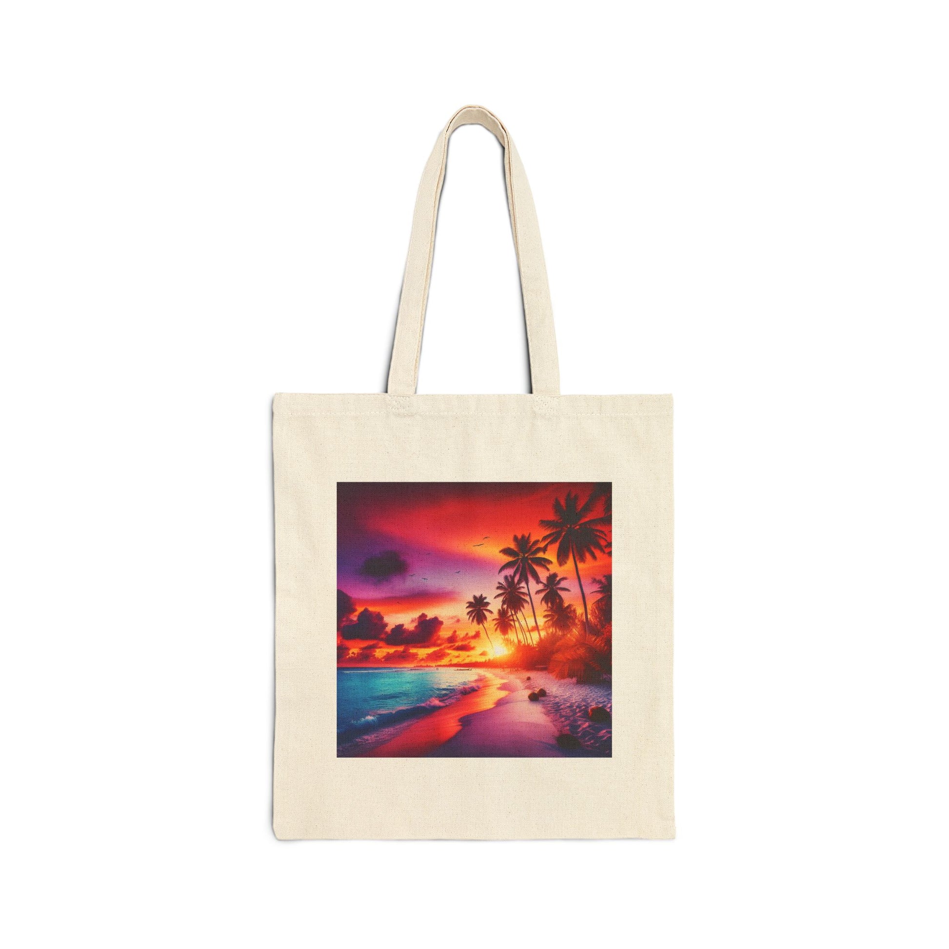 "Indulge in paradise with our 100% Cotton Canvas Bag, showcasing a vivid tropical sunset design. Experience tranquility with vibrant oranges, purples and reds adorning palm tree silhouettes, and an azure sea kissing a white sandy beach. Perfect additions are playful coconuts and distant seagulls. Carry the beach with our durable, dreamy canvas bag. #CottonCanvasBag #BeachDesign #TropicalSunset #CanvasBag #PalmTrees #SandyBeach #AzureSea #Seagulls #DurableBags #DreamyBeachBag"