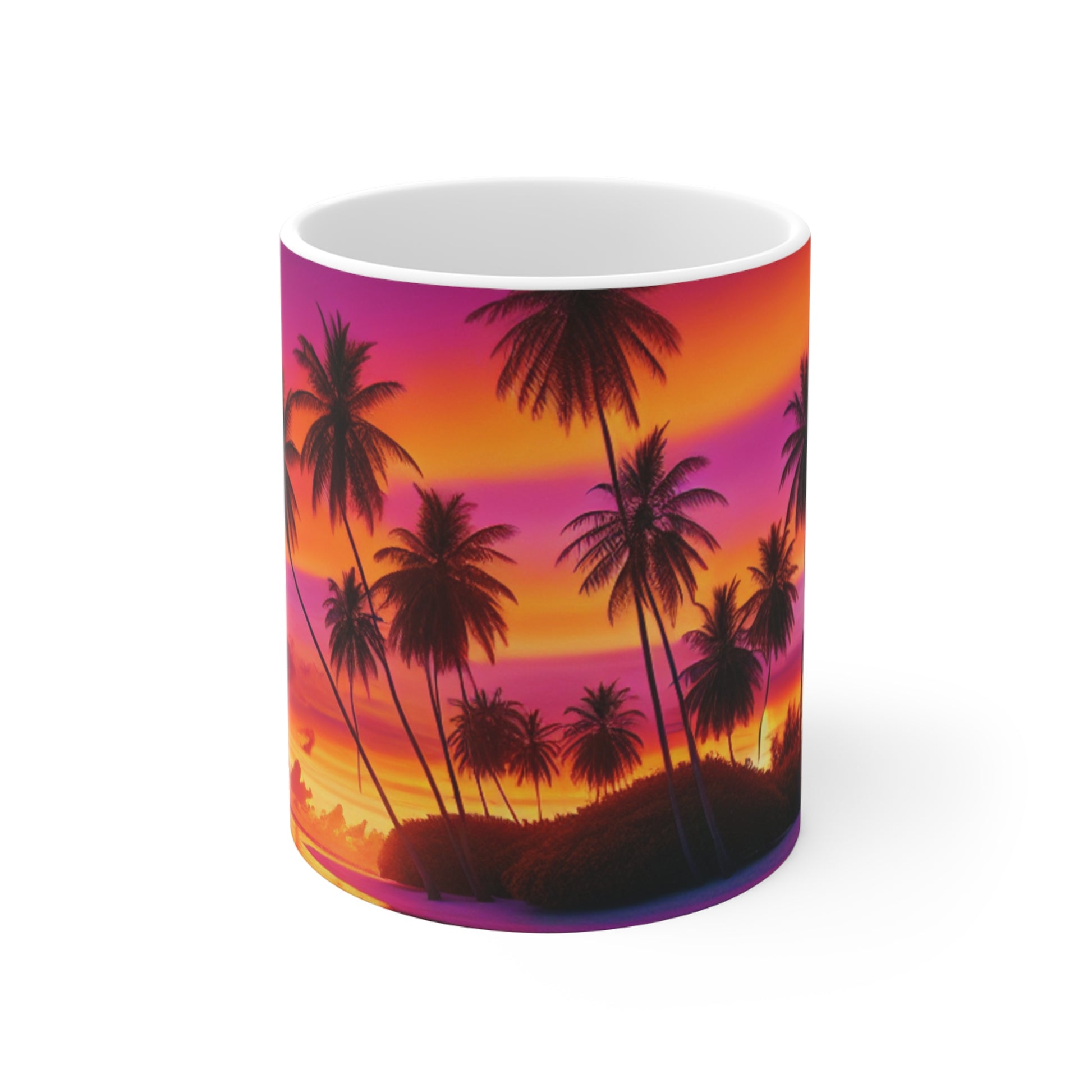Sip from our 11oz white mug and escape to a tropical landscape at dusk. Marvel at the majestic sunset hues of vibrant orange, deep purple, and velvety pink. Admire the silhouette of slender palm trees against a pristine white sand beach and tranquil azure waters. #TropicalMug #SunsetDesign #BeachVibes #PalmTrees #VacationDreaming #OceanWaves #CoffeeLovers #TeaTime #HomeDecor #UniqueMugs. Lead and BPA-free