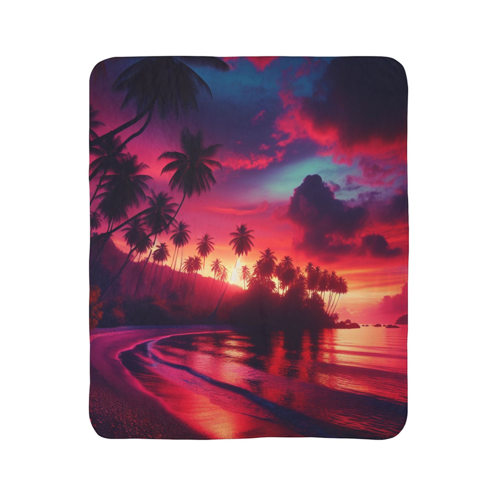 Experience the warmth and vibrance of a tropical sunset with our 100% Polyester Sherpa Fleece Blanket. Its design features vivid palms and a soothing beach at dusk, rendered in soft textures that beckon relaxation. Perfect for snuggly evenings or as a vibrant decor piece. #SherpaFleece #TropicalDesign #SunsetBlanket #BeachDecor #CozyComfort #PolyesterBlanket #VibrantDesign #HomeDecor #TropicalInspired #EyeCatchingBlanket 1/8'' (3mm) thick for extra warmth and a feel that is supremely soft to the touch.All fleeces come with a one-sided print and a velvety, plush backside for extra coziness. Available in 2 sizes.