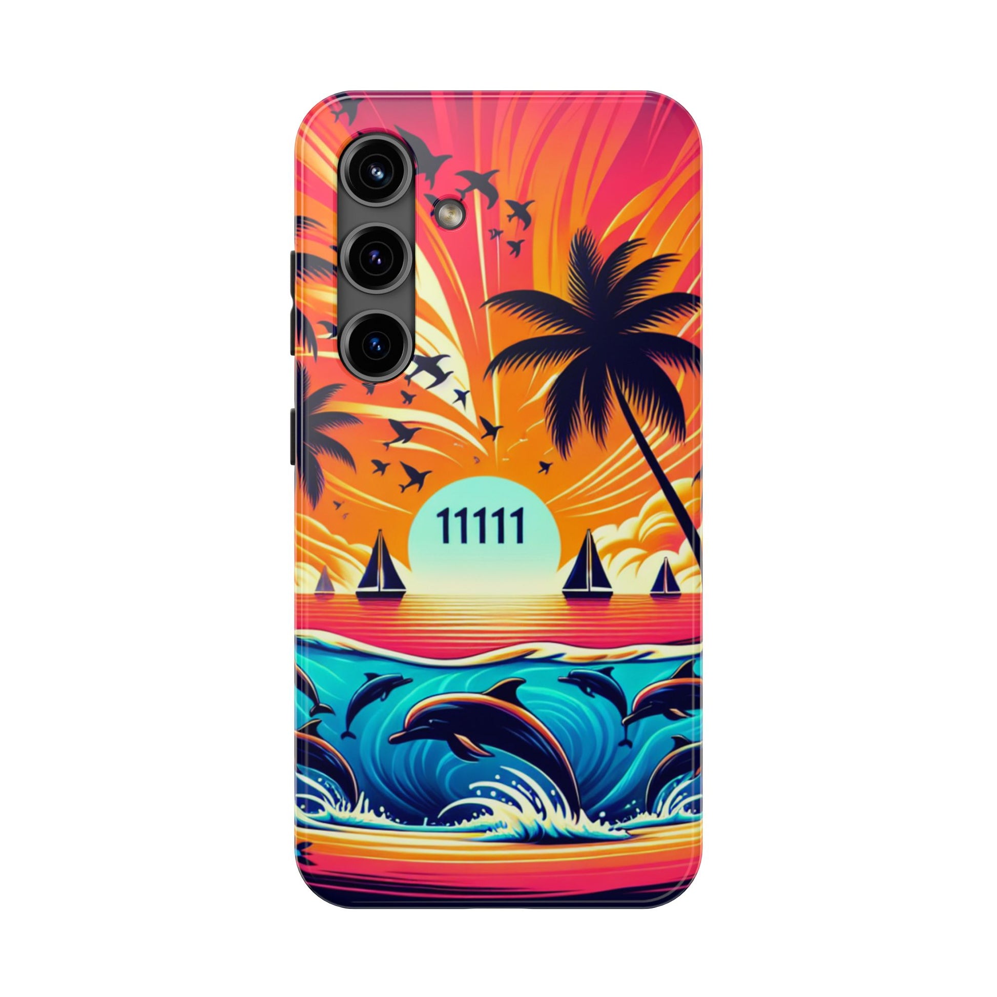 Unleash the adventurer in you with the Samsung S21-S24 tough phone case. Reflecting the splendor of a tropical sunset, palm tree silhouettes, playful dolphins, and serene sailboats, it effortlessly incorporates the magical '1111' within the intricate design. Dive into this paradise now.