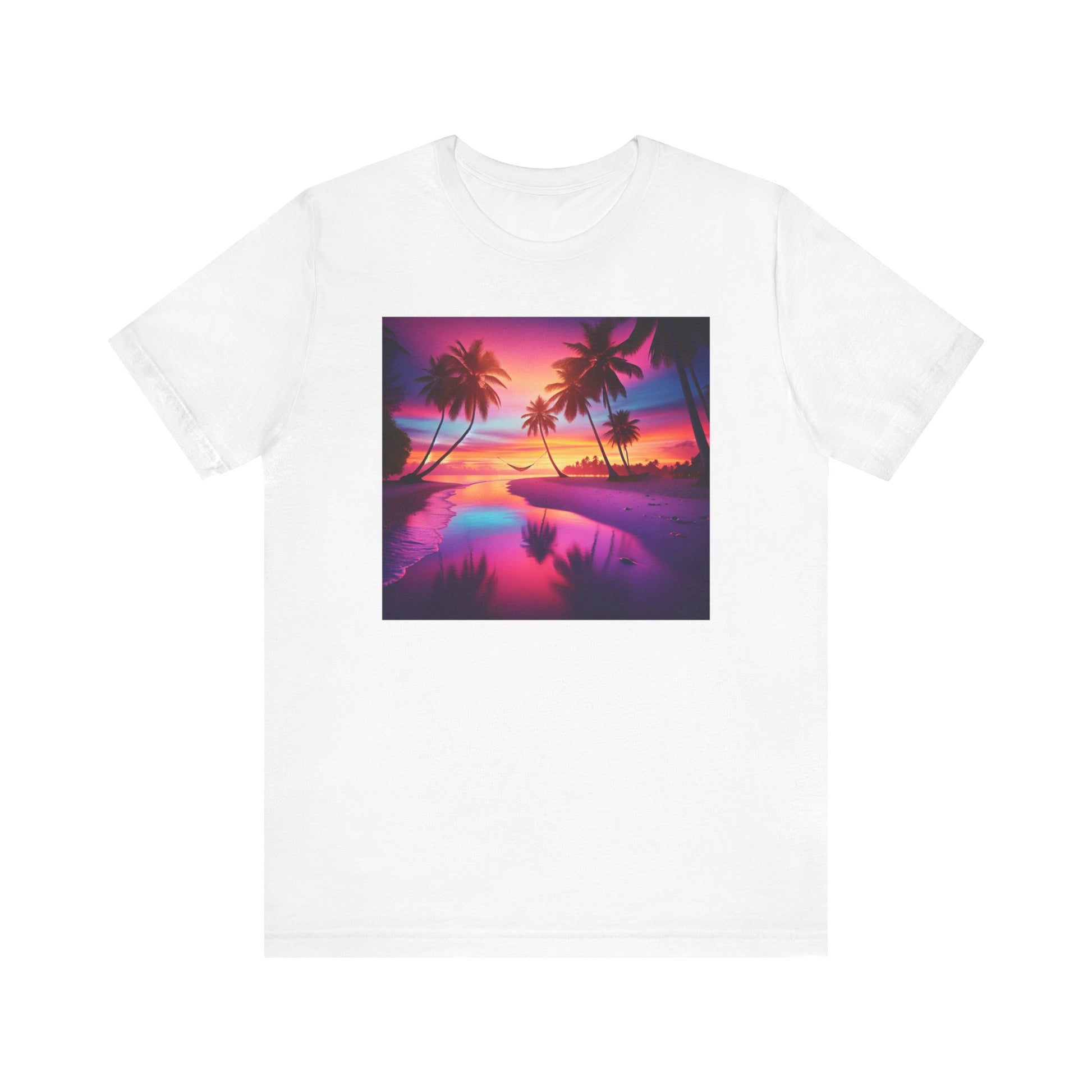 Unwind in our tropical sunset t-shirt, featuring a tranquil beach vista. Picture a sky ablaze with pink, orange, and violet, hinting at twilight. Gentle waves reflect these dazzling colors while twin palms frame a weathered hammock. Seashells add charm, creating your wearable escape. #BeachLife #SunsetTee #DreamEscape #TropicalParadise #PalmTrees #EveningSky #SummerStyle #TravelWear #VacationVibes #CoastalChic This classic unisex jersey short sleeve tee fits like a well-loved favorite. Soft cotton and quality print make users fall in love with it over and over again. These t-shirts have-ribbed knit collars to bolster shaping. The shoulders are tapered for a better fit over time. Dual side seams hold the garment's shape for longer.