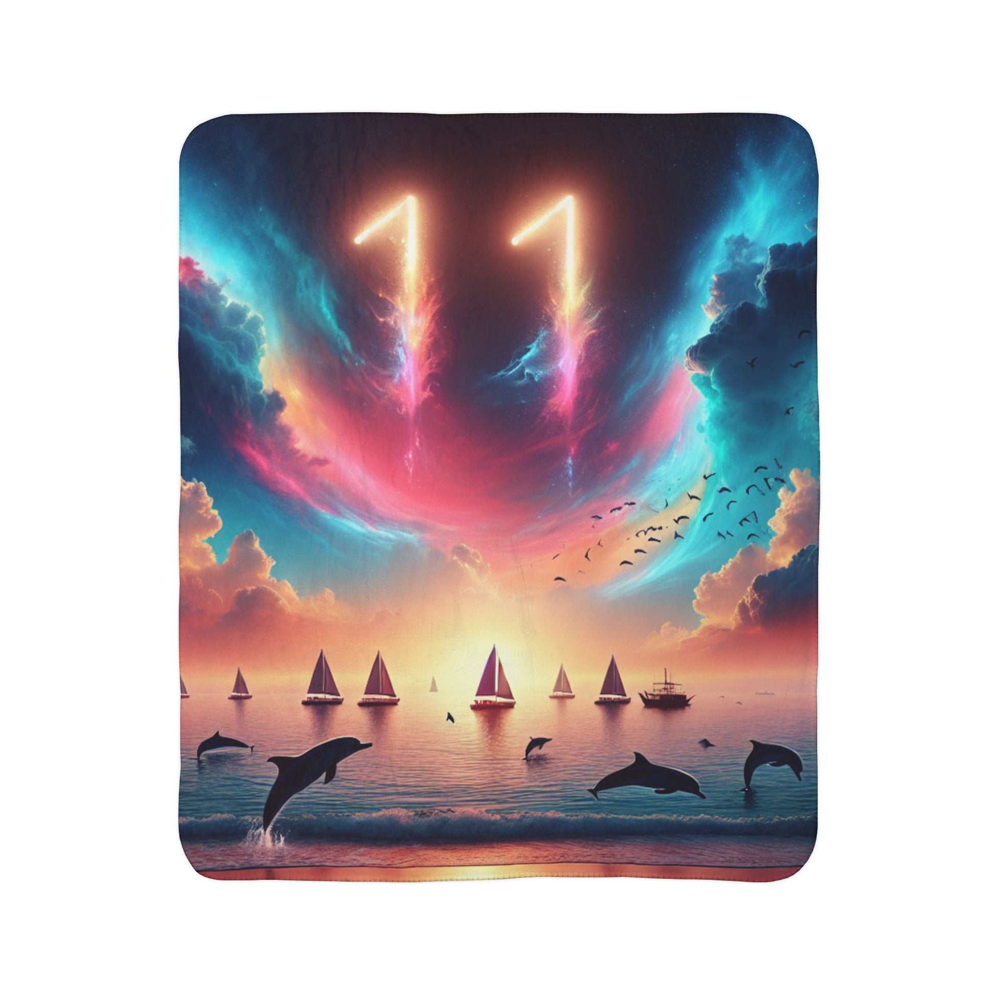 Wrap yourself in the serenity of a tropical sunset with our beach-themed Sherpa Fleece Blanket. Crafted from 100% polyester, it features a scene with silhouetted palm trees, sailboats, playful dolphins, and magical '1111' Angel Numbers illuminating the multi-hued sky. Bask in its warmth and divine tranquility. #SherpaBlanket #BeachSunset #FleeceHeaven #CozyComfort #TropicalTranquility #SailboatScene #DolphinDance #AngelNumbers #HomeDecor #LifestyleLuxuries. Angel number 1111 serves as a reminder to be mindful of your thoughts and intentions. Your angels are urging you to maintain a positive mindset and focus on what you truly desire. Take some time each day to visualize your goals and affirm your intentions.1/8'' (3mm) thick for extra warmth and a feel that is supremely soft to the touch.All fleeces come with a one-sided print and a velvety, plush backside for extra coziness.