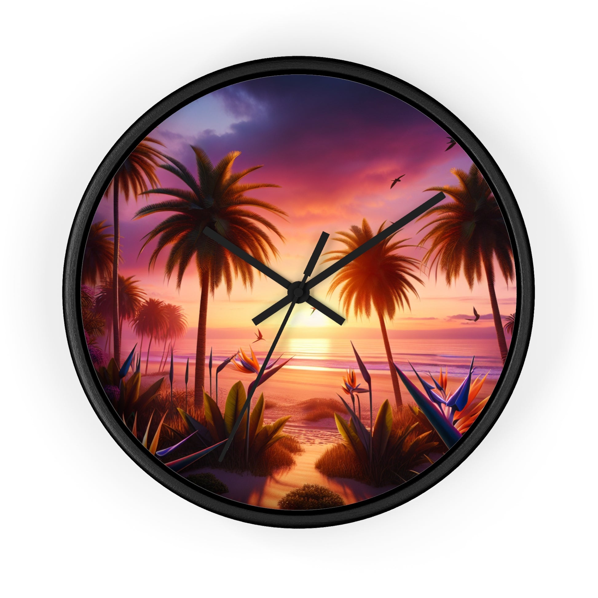 Dive into tranquility with our Tropical Beach Sunset Wall Clock. Its vibrant design captures an immersive beach sunset scene, with a sky painted in eye-catching hues of orange, purple, and pink. Note the silhouetted palm trees and unique Birds of Paradise flowers adding an exotic allure. Every glance at time will transport you to this serene, sound-of-the-waves lapping and seagulls-calling paradise. #WallClock #TropicalBeach #Sunset #HomeDecor #BeachDesign #ClockDesign #InteriorDesign #UniqueClocks #BeachStyle #TropicalDecor. Features Silent clock mechanism and available in natural wood, black and white frame variations with black or white hands to match your design. Requires one AA battery (NOT included)