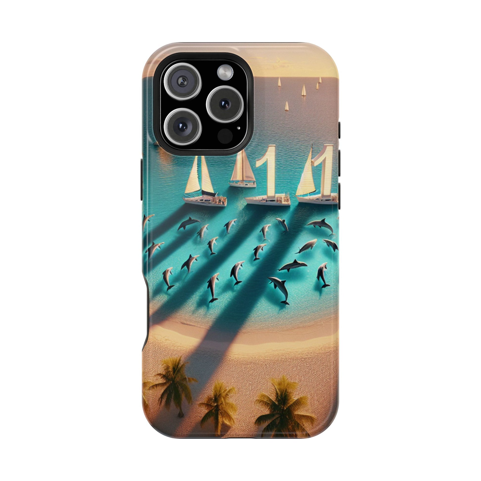 Tough Phone Case, Paradise Unveiled: A Tropical Sunset Symphony, Magnetic Iphone 13-16 Pro Plus and Max 1111, Beach Dolphins Sailboats, HD
