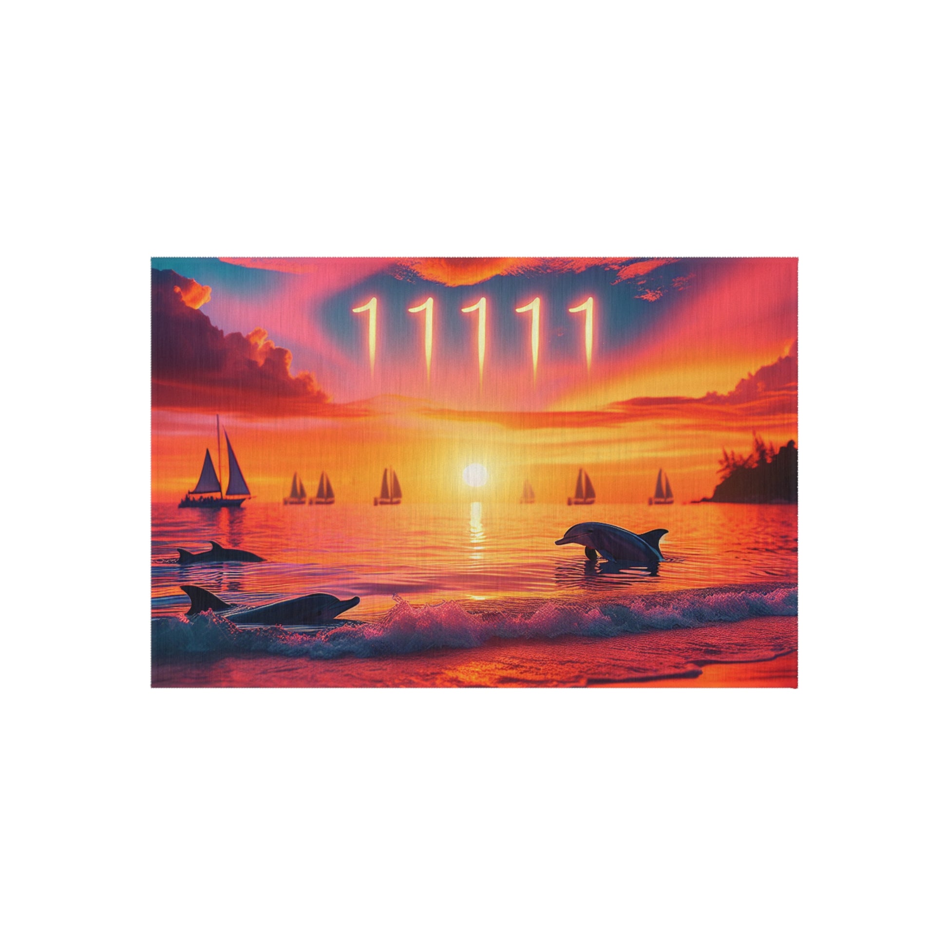 Tropical Beach Sunset with Dolphins, Sailboats and Angel number 11111 in the sky Outdoor Rug