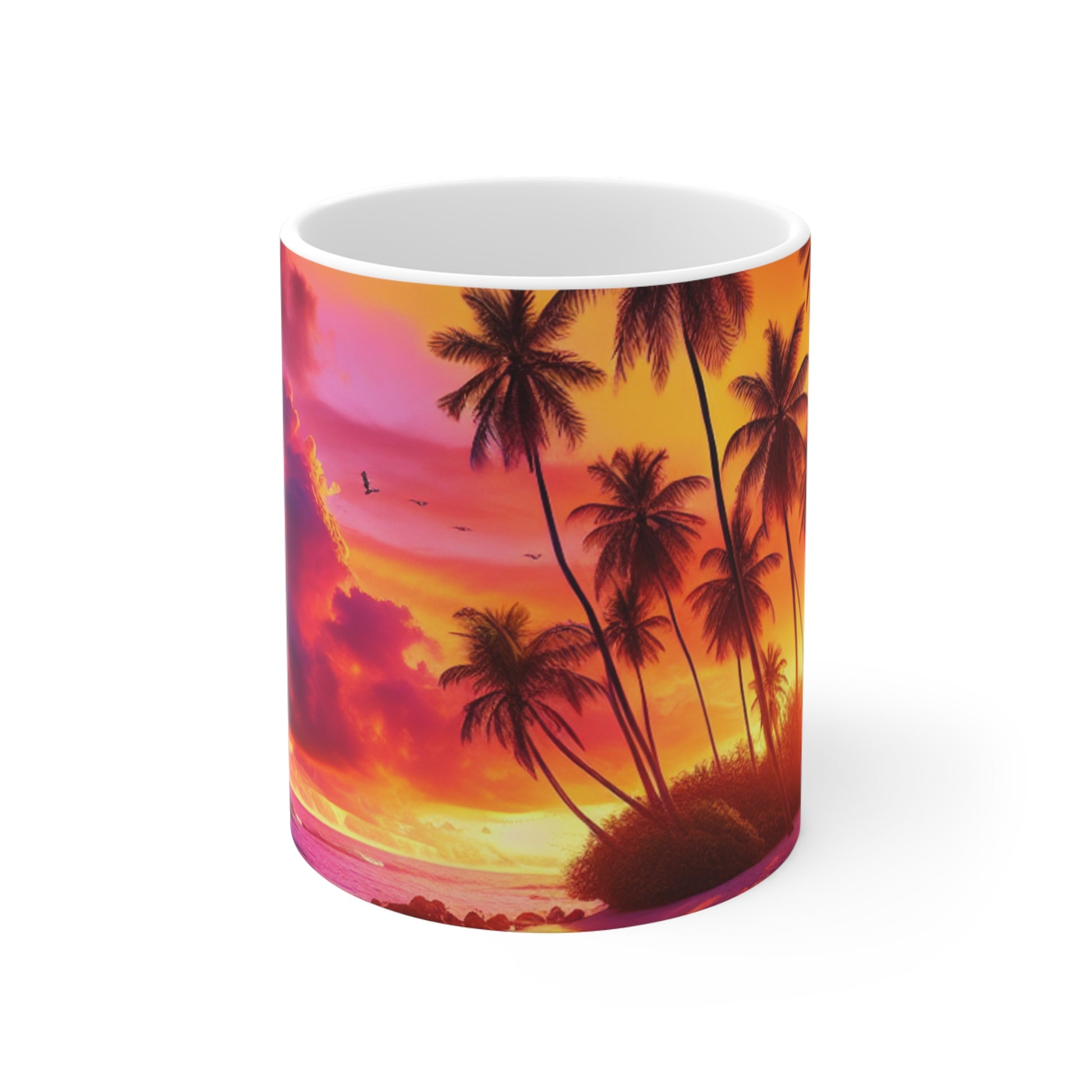 Indulge in lush tranquil, with this premium 11oz white mug. It captures a serene tropical sunset, aglow with vibrant hues. Palm trees rustle in the breeze against a vivid sky while azure sea whispers nearby. A vivacious parrot adds a dash of life that speaks to rich biodiversity. #DawnToDuskMug #MugGoals #CoffeeTime #HotDrinks #TropicalParadiseMug #SereneSunsetMug #TeaTime #CompactCup #PerfectGift #NatureLoversMug. Lead and BPA-free