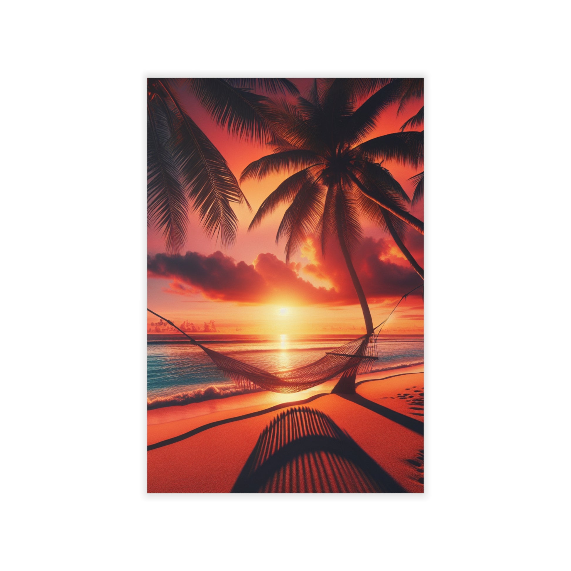 Removable and repositionable adhesive. Escape to paradise with our repositionable Beach Sunset Wall Art. This stunning visual transports you to a serene tropical landscape with vibrant sunset hues, palm silhouettes, and a tranquil ocean view. Perfect for creating your dream getaway vibe at home.